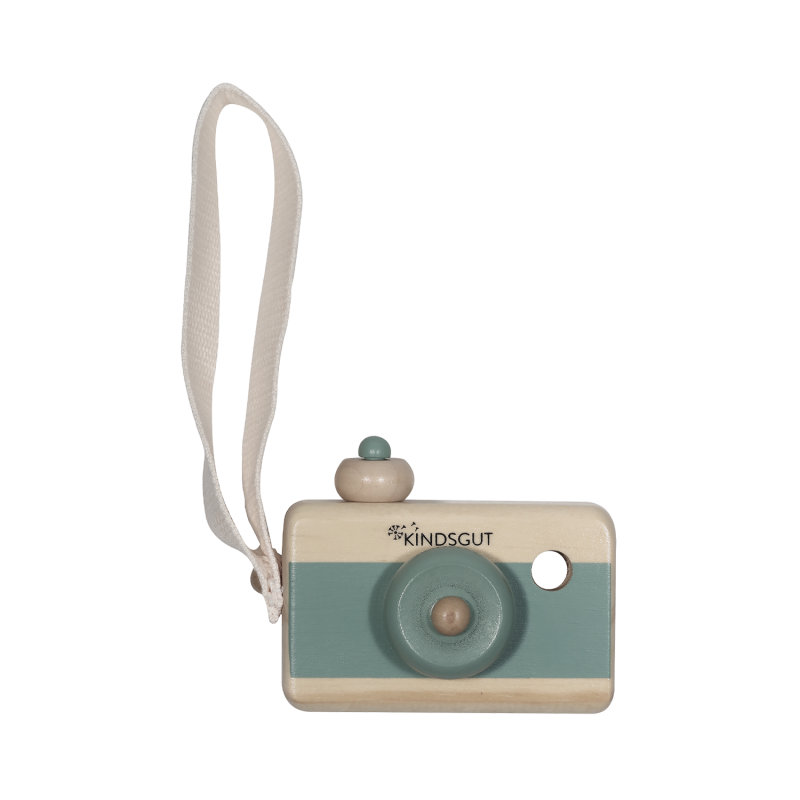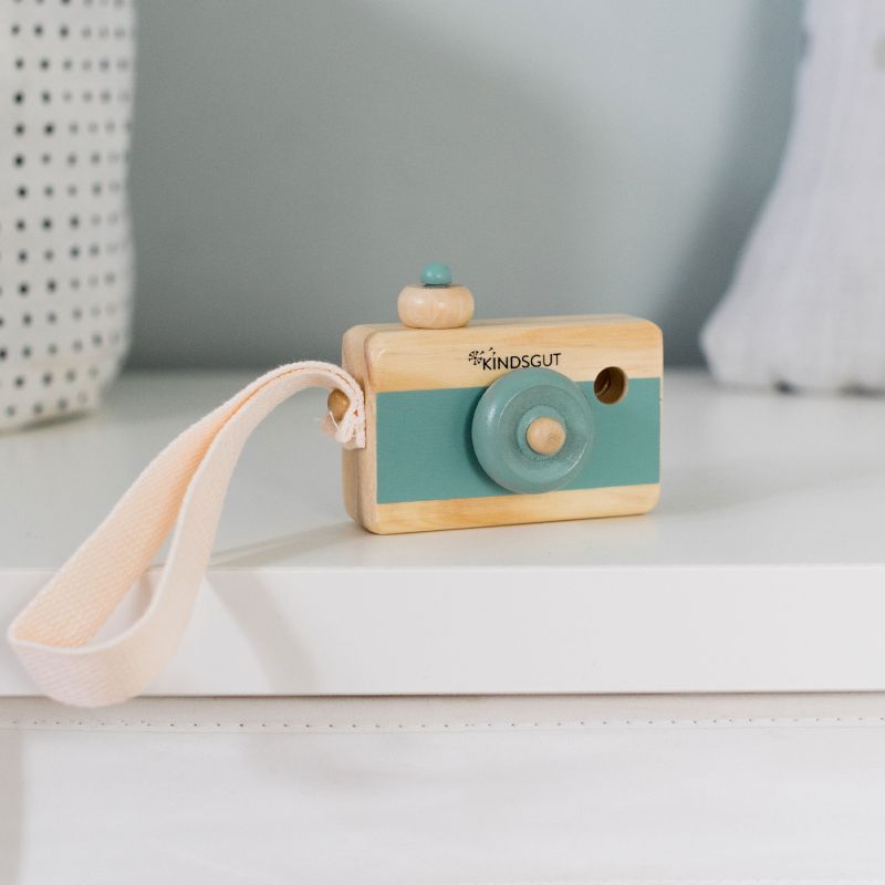 Die Kindsgut Holz-Kamera verbindet kindliches Design und schöne dezente Farben mit hochwertiger Holzqualität. Die liebevoll designte Minikamera aus Holz ist ein absoluter Bestseller und zaubert immer wieder ein Lächeln in die Gesichter von Klein & Groß! Mit der Kinderkamera aus Holz können Eure Nachwuchs Fotografinnen und Fotografen, ganz wie Mama oder Papa, durch die drehbare Linse fokussieren und auf dem Auslöseknopf „ein Bild knipsen“. Gemeinsam macht Fotografieren doppelt Spaß! So wird die Kamera auch ganz nebenbei zum Lernspielzeug, denn sie fördert die Kreativität, das freie Spiel und die Phantasie. Durch die praktische Umhängeschlaufe kann die Kamera sicher gehalten werden und eignet sich so auch als Lieblingsspielzeug für unterwegs, da sie nicht so leicht verloren geht.