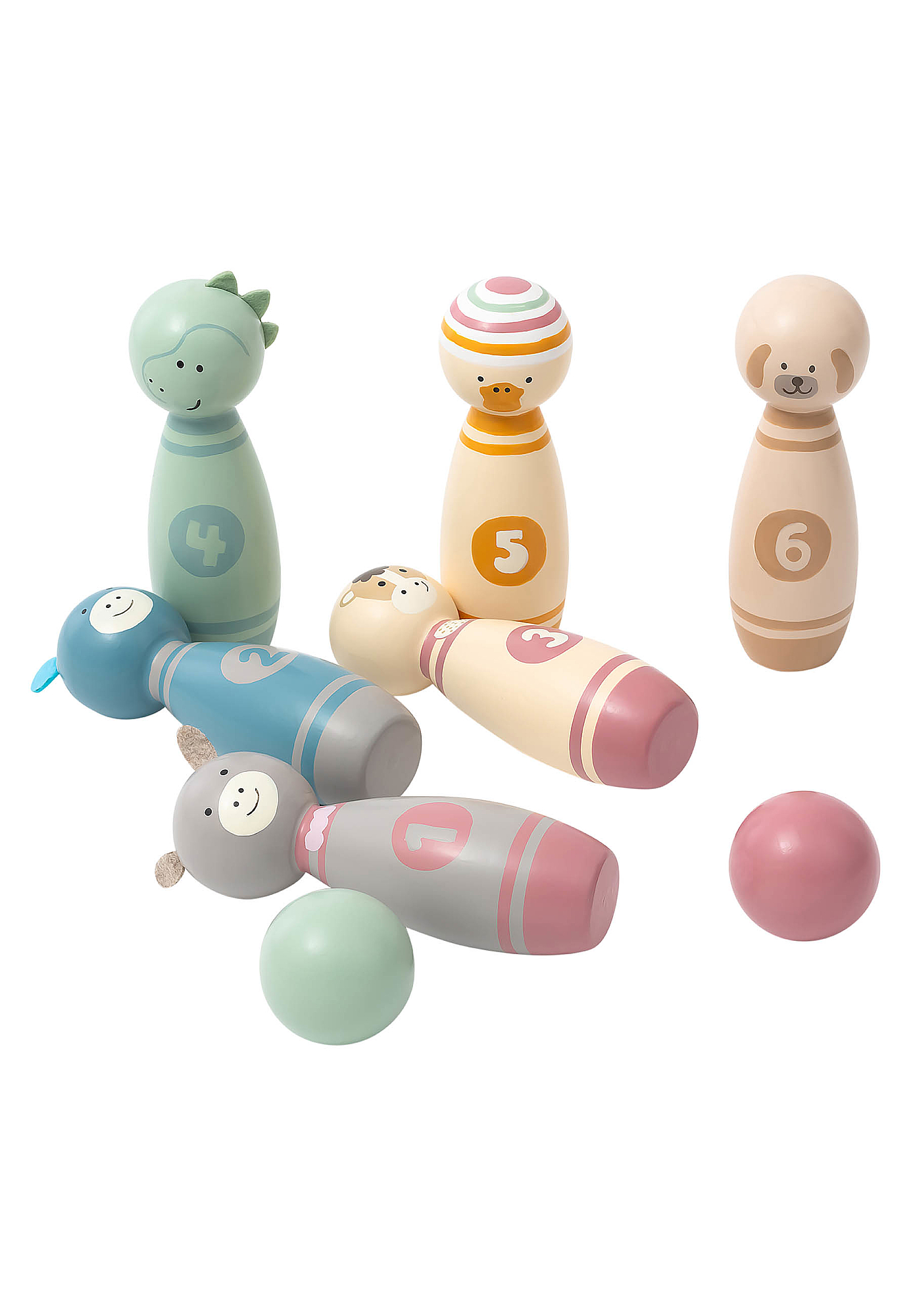 • Mit bunten Holzkegeln und kindgerechten Motiven